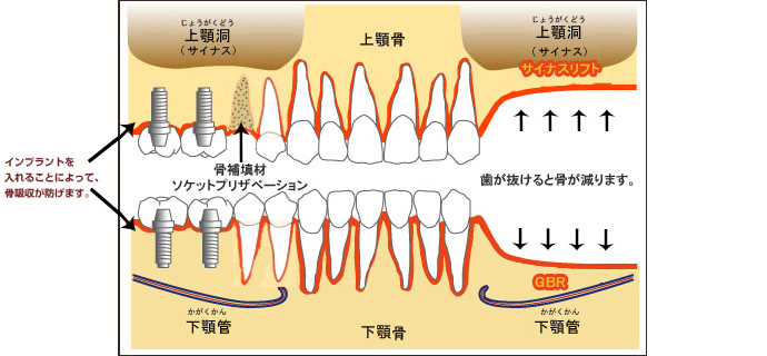 歯が抜けると、骨が吸収し、インプラントを埋入するための骨量がなくなります。